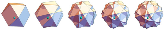 Figure 5 illustrates this, showing cuboctahedra from five different 24-cells rotated into V with varying amounts of their respective dual rotations (parameterized by ). The top and bottom rows show different arbitrary choices of initial cuboctahedra. One sees that under the direct rotation of each cuboctahedron to the primary space V, with no dual rotation (, Figure 5c), they combine into an irregular jumble, with no non-trivial symmetry. Including each rotation’s dual, however, to make it isoclinic, one sees the compounds converge to a single cuboctahedron (, left-isoclinic, Figure 5e) or to the icosahedrally symmetric C5C (, right-isoclinic, Figure 5a). This happens irrespective of which cuboctahedral equator is chosen from each 24-cell to begin with, as illustrated by the two rows: under the direct rotations (Figure 5c) they are completely different, but under the isoclinic rotations (Figure 5a,e) they become the same. A manipulable visualization of this is available in the supplementary material.