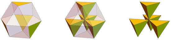 Following this line of thinking, and recalling that the ESQC is derived from , one wonders if itself might in some sense imply the 3D compounding of tetrahedral quasicrystals to generate icosahedral ones. One is encouraged, in a general sense, by the deep connections between and H-symmetric quasicrystals [27,28,29]. Regarding the specific question of compounding tetrahedral symmetries, it is of note that the FIG’s 20G has the same vertices as the well-known compound of five cuboctahedra (C5C) (more on this below); such a compound may be thought to be vaguely reminiscent of the 5-fold arrangement of 24-cells (with their cuboctahedral equators) found in Sadoc and Mosseri’s discrete Hopf fibration of the root polytope, which they used in their construction of the ESQC [24].