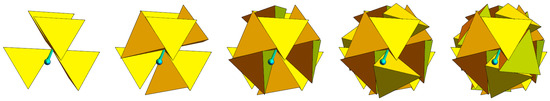 Compounding of 4Gs by rotations in 3D to make the left-handed 20G. Successive images include successive copies of the 4G, each rotated by an extra multiple of around a 5-fold axis (cyan), which is the plane-normal identified in Figure 3. The last image is the full 20G, with chiral icosahedral symmetry. Compare the compounding of cuboctahedra to create the C5C in Figure 4.