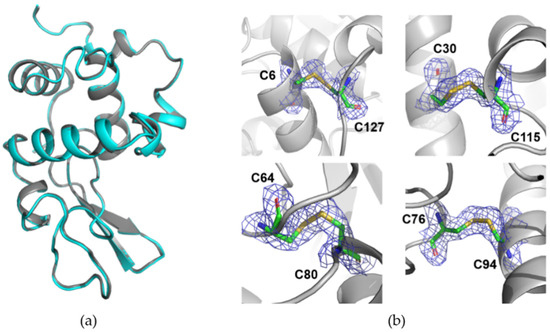 In lysozyme, four disulfide bonds are formed by eight cysteine residues (C6–C127, C30–C115, C64–C80, and C76–C94). The sulfur atoms in cysteine are relatively sensitive to radiation damage due to their higher atomic number, especially when lysozyme crystals are exposed to radiation exceeding a specific X-ray dose limit. To confirm the occurrence of radiation damage, the electron-density maps of 2mFo-DFc and mFo-DFc for the lysozyme disulfide bonds were analyzed, and significant negative electron-density maps were not observed (Figure 3b).