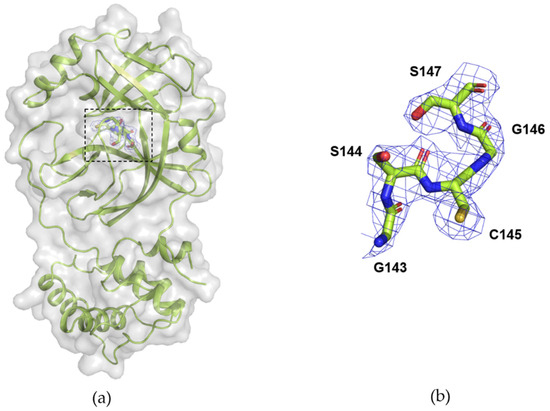 (a) Schematic representation of a protomer of the dimeric structure of Mpro, collected at 100 K using DMM. The active site is highlighted within the black box; (b) the 2mFo-DFc (marine mesh, 1.0) electron-density map for the active site and substrate binding region of Mpro. In the sticks, green represents carbon atoms, blue represents nitrogen atoms, red represents oxygen atoms, and orange represents sulfur atoms.