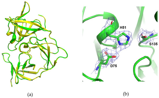 (a) Structure comparison of the NS2B/NS3 protease using DMM (green) and DCM (yellow, PDB ID: 7VXY); (b) 2mFo-DFc (marine mesh, 1.0) electron-density map for the catalytic triad (His51-Asp75-Ser135) of the NS2B/NS3 protease.