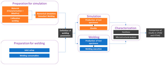 A flowchart of the developed study is shown in Figure 1. It includes numerical simulation, properly calibrated by previous multi-pass welding and using data properties obtained using JMatPro®, simulation of the thermal cycle in a Gleeble® system, and GTAW/GMAW processes for comparison with simulated specimens.