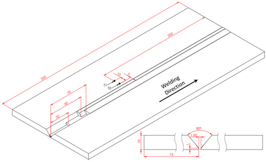 Schematic drawing, in mm, of the designed joint for weave bead welding. T1 and T2 indicate the positions of the thermocouples used.