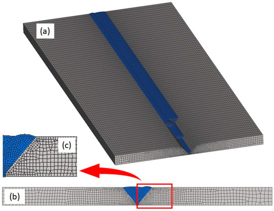 Mesh used in the simulation. 3D view (a), frontal view (b) and HAZ zoomed section showing mesh details (c).
