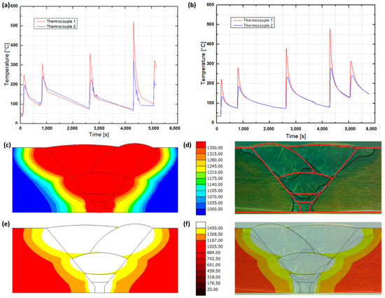 Thermal cycle measured in calibration welding (a); thermal cycle obtained in Simufact Welding simulation (b); temperature maps (c,e); pass geometry in (d,f).