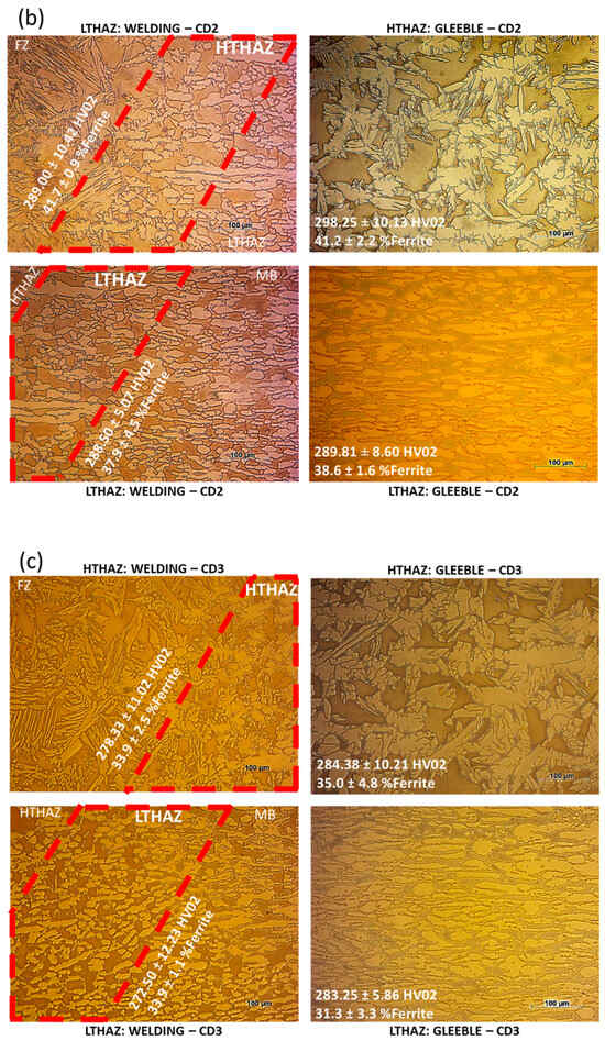 The ferrite content and microhardness values may slightly differ between the results obtained from physical simulation and actual welding, within the margin of error, as seen in Table 6. This variance occurs because the physical simulation is able to replicate the heat-affected zone (HAZ) and expand this area compared to the HAZ of a real welded joint. In the actual weld, it is difficult to differentiate between the high-temperature HAZ and low-temperature HAZ, due to their small dimensions [3,40]. The values of both the HTHAZ and the LTHAZ are quite close, with small relevant variations between the sub-regions. In this context, it is important to consider these results in conjunction with the morphological analysis of the phases present. Additionally, it is necessary to emphasize the difficulty of identifying a specific region of HAZ in the welded joint, due to its reduced dimensions and the microstructural gradient between adjacent sub-regions.