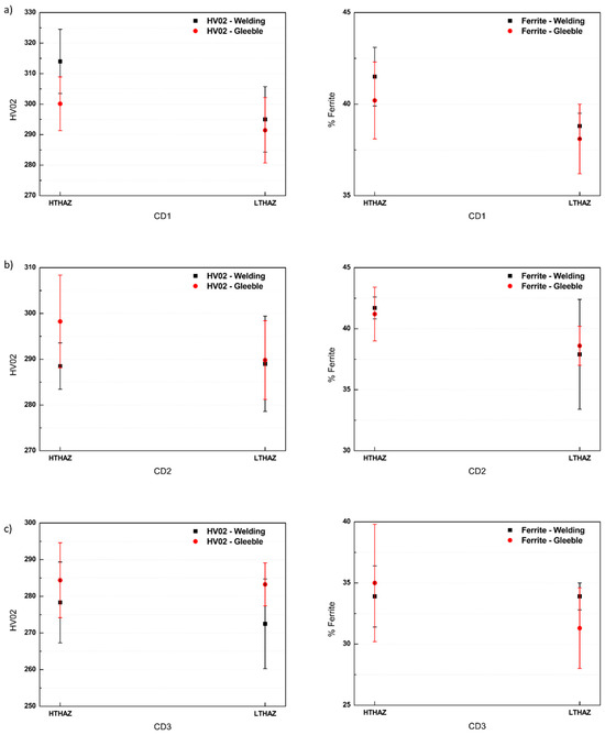 Comparison between HAZ sub-regions in welded specimens (black) and in Gleeble® (red) specimens, both in term of percentage ferrite and microhardness, in conditions CD1 (a), CD2 (b), and CD3 (c).