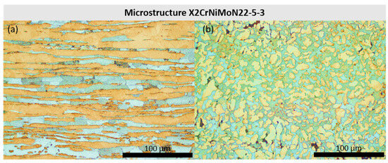 Multiphase materials with a high fraction of contributing phases are interesting candidates for structural materials in engineering applications, as such materials often combine different material properties in a positive way. Duplex stainless steels are an example of such a class of multiphase materials and are becoming increasingly popular as construction materials in mechanical and industrial engineering, as these steels optimally combine the advantages of austenitic stainless steels and ferritic steels. Such steel grades generally have good mechanical properties, resulting in a high strength combined with good ductility. In addition, duplex stainless steels often have better corrosion resistance than conventional austenitic steels, which makes them attractive for applications in, i.a. the chemical and petrochemical industries, in seawater desalination plants and in offshore technology [1,2,3,4,5]. In principle, when producing metallic technical components through processes where plastic deformation and/or thermal energy are introduced, it can be assumed that phase-specific crystallographic textures and/or phase-specific residual stress (RS) states are introduced or affected. Thus, a change in the phase-specific RS as well as the phase-specific texture can be expected along an industrial production route [6,7,8,9,10]. This was impressively demonstrated in [6] for two duplex steels processed through rolling. The duplex steels investigated developed more pronounced crystallographic textures with increasing deformation. Since these crystallographic textures can have an influence on the resulting RS, and also on RS analysis, it is necessary to know the existing crystallographic texture state. In [11], it was shown for a duplex steel with a crystallographic texture subjected to a deep rolling process that this mechanical surface treatment also affects the phase-specific crystallographic texture in the near-surface region, with the side-effect being that, for X-ray residual stress analysis oscillations of 2θ vs. distributions were drastically reduced.