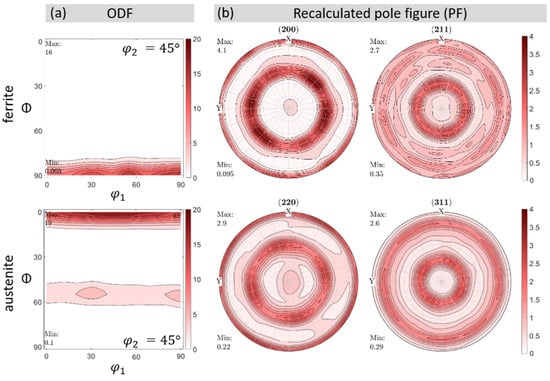 Results of crystallographic texture analysis for the as-received material’s state, as used for input data in the EPSC modelling. On the left, (a) the cut (Bunge notation) through the orientation density function (ODF), and on the right, (b) PFs for the {200} and {211} lattice planes for the ferrite phase and {220} and {311} for the austenite phase, respectively. The PFs were recalculated from the phase-specific ODFs using the open source toolbox MTEX [40] in MATLAB.