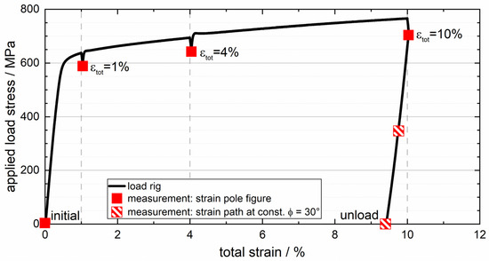 Macroscopic stress–strain curve of the performed strain pole figure experiment. After reaching the target strain ( 1, 4 or 10%), the sample was held under position control for 15 min before the measurements were started to allow for the relaxation of time-dependent effects that might affect the results of the neutron diffraction analysis.