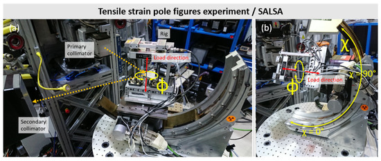 Experimental set-up used for SALSA/ILL [36]. In (a) the mounting of the tension–compression rig in the Eulerian cradle at the tilt position χ = 0° is shown, and the beam path is indicated, including the primary and secondary collimators. In (b) the tension–compression rig at a tilting angle χ = 90° is presented, and the rotation angles χ and φ are indicated.