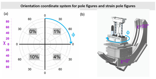 Coordinate system that is applied for the graphical illustration of the determined intensities and lattice strain data. In (a) a 2D plot with the axes Φ and χ is presented, which forms the basis of the presentation of the pole figure (in quadrants). For the illustration of the change of the determined values with the applied load strain, the applied macroscopic load strain in each quadrant of the image is indicated in a grey box. The normal to the sample surface points out from the image plane at the origin of the diagram; in (b) the rotation axes χ and φ are indicated for the schematical set-up, which are relevant for pole figure determination.