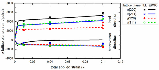 For the {200} lattice plane of the b.c.c ferrite phase, the corresponding results are presented in Figure 12. The lattice plane strain vs. distributions for the {200} lattice plane exhibit a strong curvature due to elastic and plastic anisotropy. Qualitatively, the associated EPSC modelling predicts this curvature rather well. However, a detailed examination of the values shows clear deviations. The larger deviation in contrast to the results for the {211} lattice plane is due to the fact that the ferrite {200} lattice plane is much more sensitive to plastic anisotropy [12,13,18,59].