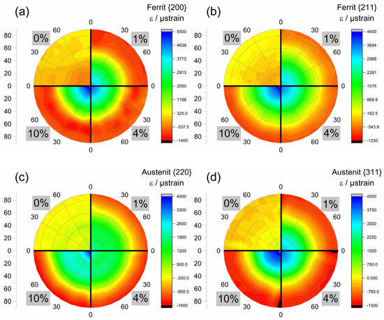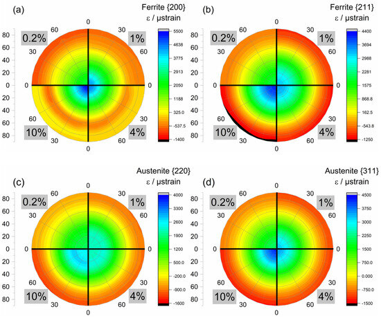 Figure 7 shows the experimentally determined strain distributions presented as strain PFs. Here, according to the used convention, the azimuth angle is referred to as φ (rotation around the normal direction) and the tilt angle as χ, with χ = 0° as the sample’s load direction (cf. Figure 4 and Figure 5). In the partial images Figure 7a,b, the strain PFs for the ferrite {200} and {211} lattice planes are presented, respectively. The corresponding lattice strain PFs for the austenite phases are shown in partial images Figure 7c, for the {220} lattice plane, and Figure 7d, for the {311} lattice plane. In each case, the {hkl} plane and phase-specific strain PFs for the initial state and for the mechanically loaded states at total strains of 1%, 4% and 10% are shown in one strain PF, i.e., each quadrant represents the lattice strain PF for one loading state, and all four figures belonging to the same {hkl} lattice plane families are scaled identically. From the colour gradations of the initial state, it can be seen that the nearly load-free sample (only 5 MPa pre-load is used as the initial load to compensate for the backlash of the sample clamping) exhibits a phase- or {hkl}-plane-specific residual stress state. The subsequent load direction of the sample (cf. Figure 4 and Figure 5) is the normal direction in Figure 7 (χ = 0°). From this it can be seen that, for the two lattice planes of the ferrite phase, in their initial state, rather low compressive lattice strains in the longitudinal direction and low tensile lattice strains in the radial direction exist. For the two lattice planes of the austenite phase, on the other hand, tensile lattice strains are present in the later load direction and compressive lattice strains in the radial direction. It should be emphasized that this initial lattice strain distribution is not identical for the two lattice planes of the same phase. For instance, for the ferrite phase, for the {200} lattice plane higher lattice strains are determined than for the {211} lattice plane. On the other hand, the residual lattice strain state initially present is significantly lower for the austenite {220} lattice plane compared with the {311} lattice plane. Under uniaxial mechanical load, the maximum tensile lattice strain always appears in the centre (χ = 0°) of the strain PFs, as expected. In the radial direction, however, compressive lattice strains are always determined. In general, it can be seen that all strain PFs plotted here for the loaded states are axisymmetric, as could be expected from the intensity PFs shown in Figure 2. However, a closer look reveals that, for the {220} lattice plane of the austenite phase, an intermediate maximum forms under the applied load at an angle of about χ = 40°. For the {200} lattice plane of the ferrite phase, the formation of a lattice strain minimum at an angle of approx. χ = 65° can be observed under the applied load. For all four {hkl} lattice plane families considered here, slight variations in lattice strain are also observed along their graphs for the same φ angle. This can be seen particularly well at 4% total strain for the ferrite {200} or the austenite {311} lattice planes at an angle of χ = 90°. As a first approximation, all four lattice planes show an almost linear distribution of the lattice strain vs. the tilt angle χ in their initial state, according to Figure 7. Overall, the strain PFs in Figure 7 do not show any strain distributions under load that deviate from the expected conical shape. This can be expected from their rather homogeneous texture characteristics (cf. Figure 2); hence, much larger inhomogeneities would be expected for deviating textures, with a lower symmetry with regard to the angle φ.