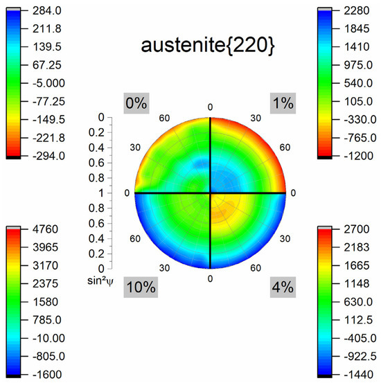 It has been shown in the literature that, based on load stress experiments, some lattice planes have been identified to show only a low sensitivity to these plastically induced microstresses. For f.c.c. (face-centred cubic) phases, such as the austenite phase in duplex stainless steels, these are the {111}, {311} and {220} diffraction lines (e.g., [12,15,19,20,21,22]) and for b.c.c. (body-centred cubic) phases, i.e., for the ferrite phase, the {110} and {211} lattice planes are recommended for stress analysis (e.g., [12,19,23,24]). Moreover, it must be noted that the plastic anisotropy effect (intergranular strains and stresses) is also related to crystallographic texture and texture evolution [18]. Regarding neutron stress analysis, these intergranular strains can also affect the reference value and can lead, in particular, for multiphase materials, to erroneous stress calculations. In addition, the changing load partitioning leads to a deviating behaviour of the different lattice planes compared to a single-phase material. To better understand the influence of phase-specific textures on the behaviour of the different lattice planes under load, strain pole figures (strain PFs) are perfect. Examples of strain PFs, among others, are shown in [25,26,27]. Because no load stress experiments are carried out on real components and, in addition, often in residual stress analyses the lattice strain is determined only in the three supposedly principal directions, a possibly occurring pronounced plastic anisotropy effect cannot be detected. For this purpose, either a complete load stress analysis must be carried out for a sufficient number of independent orientations or the sample must be tilted to specifically tilt the scattering vector to detect anisotropic effects. In order to take that into account in diffraction stress analysis, measurements performed according to the well-known method [28] are frequently applied for lab-scaled X-ray stress analysis, but these could well be extended also to neutron or high-energy synchrotron X-ray measurements.