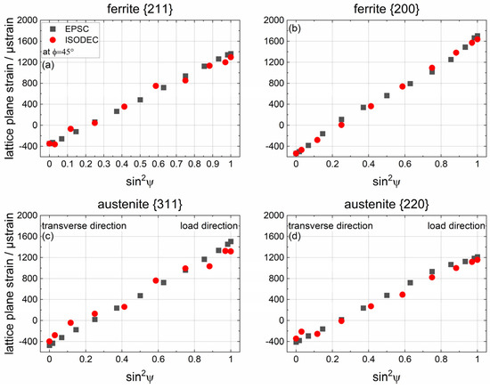 The results for a section at φ = 45° and an assumed unidirectional loading stress of 300 MPa are shown in Figure 9. In Figure 9a,b are the ferrite phase lattice planes {211} and {200}, respectively. In both cases there is very good agreement between the predictions of the EPSC model and the software ISODEC. In Figure 9c,d, the results for the austenite phase lattice planes {311} and {220} are shown. Likewise, for the austenite phase a rather good agreement can be noticed, although there are slightly larger deviations between the two numerical approaches. This is shown by the fact that the ISODEC prediction tends to predict slightly lower lattice plane strains than the EPSC model, and this deviation is slightly more pronounced for the {311} lattice plane than for the {220} lattice plane. The {311} lattice plane of austenite has the largest deviation of about 188 µstrain in the loading direction. Despite this deviation, there is a good agreement based on the data shown in Figure 9, i.e., the EPSC model can be considered suitable for predicting {hkl}-specific lattice strains.