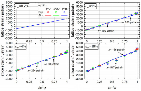 Finally, the corresponding results for the austenite {311} lattice plane are presented in Figure 14. The lattice strain vs. plots indicate that there is rather good agreement between the experimental and simulated results. In general, the non-linearities of the plotted distributions are rather moderate, which is expected since the {311} plane of the f.c.c. lattice structures is considered, in the literature, e.g., [12,15], to be rather insensitive to plastic anisotropy effects, which furthermore leads to the recommendation of using the {311} plane of f.c.c. for residual stress measurements. This also applies to the {211} lattice plane in the b.c.c. ferrite phase.