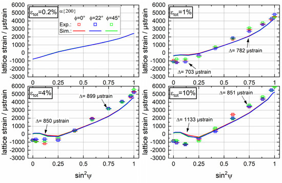 In Figure 13, the lattice strain vs. plots for the austenite {220} lattice plane are presented. The results indicate that over a wide range there is a good agreement between the numerical simulation and the experiment. Regardless of the rather high scatter of the results, clear differences only occur in the vicinity of the load direction, i.e., close to = 1.