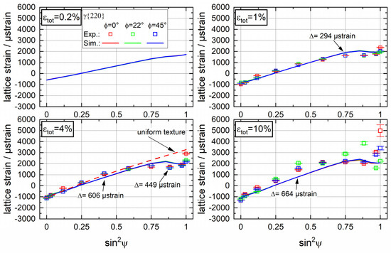 For the load case ‘4% total strain’ a further EPSC simulation was performed by omitting the crystallographic texture of the phases (designated as the ‘uniform texture’), with the intention to illustrate the effect of texture on the results and to underline the requirement to consider the phase-specific texture information in the EPSC model. Without texture an almost linear path for lattice strain vs. was determined, which is far from the experimentally determined values. Hence, only by adding the experimentally determined phase-specific texture can the present curved distribution be approximated at all. However, this statement should not obscure the fact that deviations between the experimentally determined results and the data from EPSC modelling occur for the austenite phase.