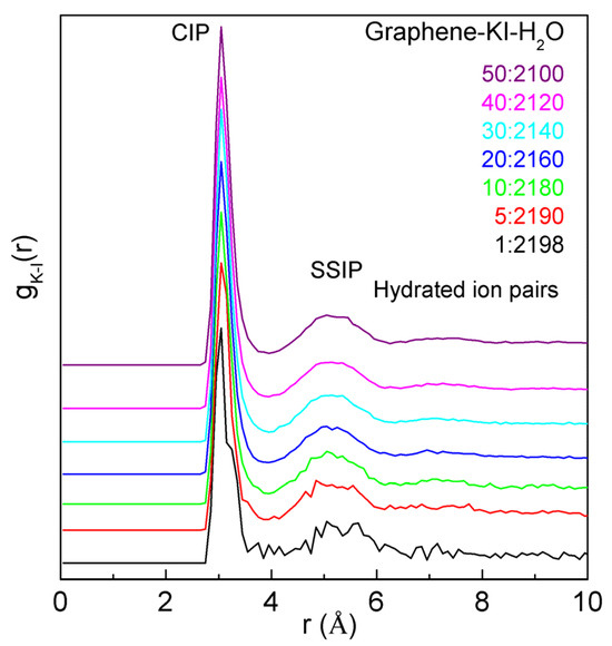 The calculated radial distribution functions between K+ and I− ions (gK-I(r)) of various graphene-KI-H2O systems.