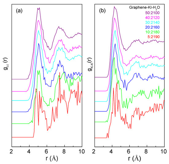 The radial distribution functions between I− ions (gI-I(r)) (a) and between K+ ions (gK-K(r)) (b) of various KI solutions in the presence of graphene sheets.