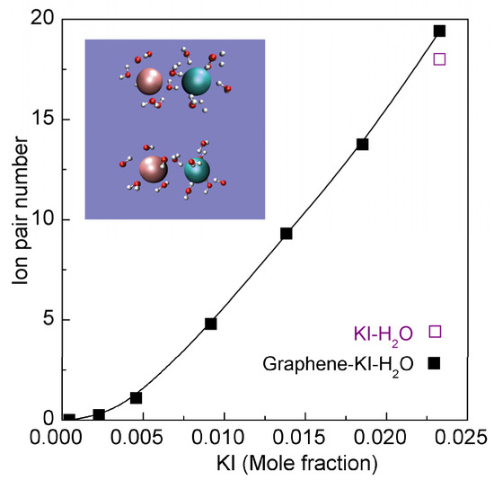 In the MD simulations, the ion pair was found not only in the high-KI-concentration solution but also in the low-KI-concentration solution. However, with increasing KI concentrations, more ion pairs in water appear (Figure 3). This has been demonstrated through experimental measurements [39,40]. Additionally, as the graphene sheets are immersed into the solutions, the number of ion pairs is higher than that in pure KI solutions (Figure 3). In addition, in the graphene-KI-H2O system (KI:H2O = 50:2100), the maximum KI aggregate size is five. However, the maximum aggregate size in the pure KI solutions (KI:H2O = 50:2099) is four. These findings may be related to the effects of graphene sheets on the dissolved behaviors of KI in water.