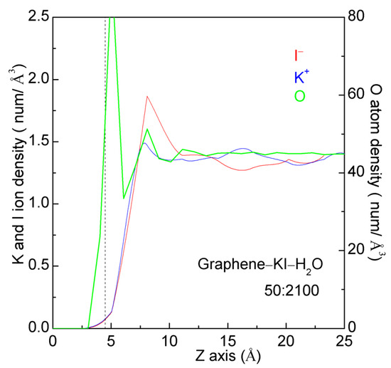This is in agreement with Dočkal et al. [41] and Chen et al.’s [42] simulations on graphene–aqueous solution interfaces. Additionally, compared with potassium ions, a higher iodide ion density can be found at the graphene–water interface. This means that the iodides show more surface affinity than the potassium ions. Regarding the origin of ion interfacial distribution, this is closely related to the effects of the hydrophobic surface of the graphene.