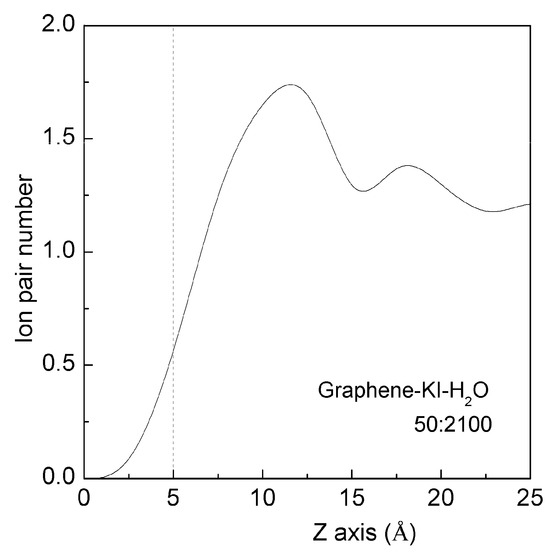 Additionally, it was found that the ion pairs are not uniformly distributed in the solutions. In comparison with the interior of the solution, the ion pairs tend to accumulate at the graphene–water interface (Figure 5). This is in accordance with Smith and Rick’s simulations [43] of aqueous solutions. Due to the appearance of foreign surfaces in aqueous solutions, this promotes the formation of solute aggregates in water, which tend to accumulate on the foreign surfaces.