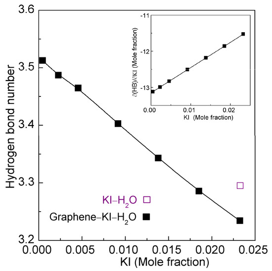 When the KI salts are dissolved in water, this leads to a decrease in the number of hydrogen bonds in water (Figure 6). It is related to the interfacial water of solutes and external surfaces. However, with increasing KI concentrations, the effects of KI on the hydrogen bonding (∂HB/∂KI (Mole fraction)) of water become weak. This is due to the decrease in the ion surface area available for interfacial water molecules. Additionally, this is also in accordance with our recent study [36] on the structure of NaCl solutions. This means that, with increasing KI concentrations, the dissolved ions are accumulated and repelled to the graphene–water interfaces. Regarding the origin of ion accumulation around the surface, it is ascribed to maximize the hydrogen bonds of water (or bulk water).