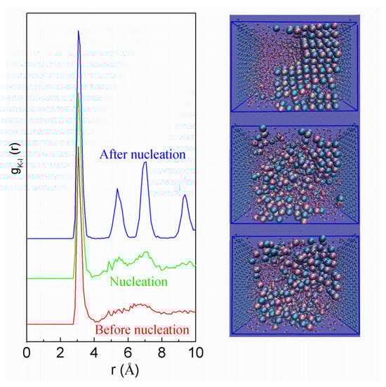 According to the MD simulations, the K+ and I− ions accumulate to form an aggregate, and KI nucleation first takes place in the aggregate. This is in agreement with the other experimental and theoretical studies [36,37,38] on nucleation. Different from the solute aggregate, a periodic crystal lattice can appear as nucleation takes place in the aggregate. In comparison with the KI RDFs prior to nucleation, the second peak is well split into two peaks as the KI crystal appears in the solute aggregate (Figure 7). As the KI crystal grows, these two peaks become stronger, and another peak at 9.4 Å can also be detected in the calculated RDFs.