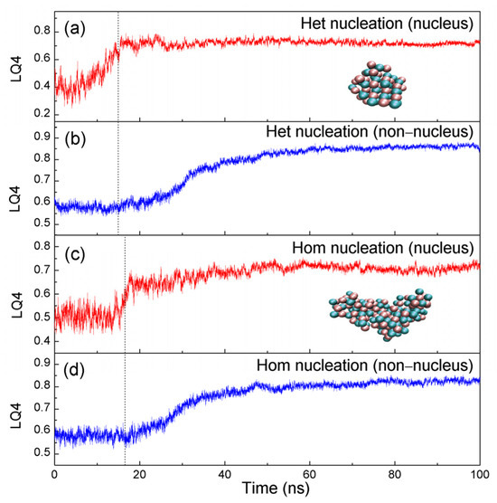 The LQ4 of nucleus (aggregate) and non-nucleus (non-aggregate) zones during both the heterogeneous (a,b) and homogeneous (c,d) nucleation processes in solutions. As nucleation occurs in the aggregate, the critical aggregate is determined (a,c); the corresponding order parameters are indicated by dashed lines.