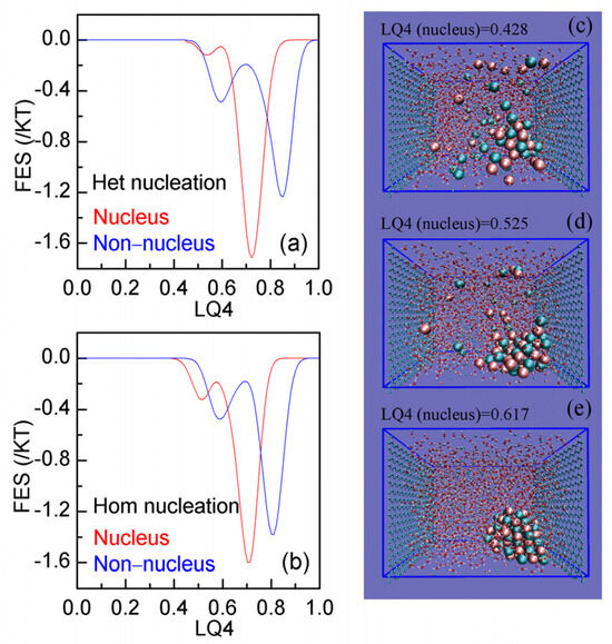 During the simulations, the LQ4 order parameters of nucleus and non-nucleus zones are determined during both heterogeneous and homogeneous nucleation processes. From Figure 8, it is observed that as KI crystals nucleate and grow in the solutions, there is an increase in these order parameters. Moreover, the LQ4 parameters of nucleus zones precede those of non-nucleus zones, indicating that nucleation is triggered and driven by the formation of KI crystal nuclei in water. Therefore, these calculated LQ4 order parameters can be used to measure the nucleation process of KI crystals in the solutions.