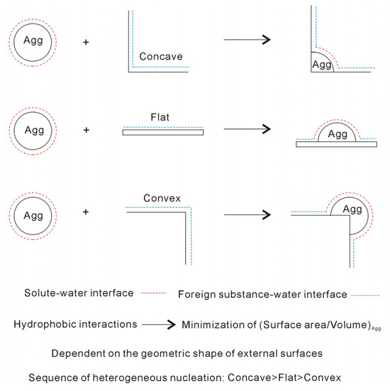 From the above discussion, the foreign surfaces mainly affect the structure of interfacial water. To maximize the number of hydrogen bonds in water, the dissolved solutes tend to aggregate at the external surfaces to minimize the ratio of surface area (solute–water interface) to volume of aggregate. It is derived that the formation of an aggregate may be related to the geometric characteristics of foreign substances, especially the geometric shape (Figure 10). To maximize the number of hydrogen bonds in water, the dissolved solutes tend to accumulate at the corner of a concave surface (Figure 10). In comparison with flat and convex surfaces, nucleation may first occur at convex foreign surfaces (Figure 10). This may be used to control the sequence of nucleation in water. Of course, further studies are necessary.
