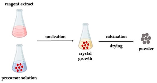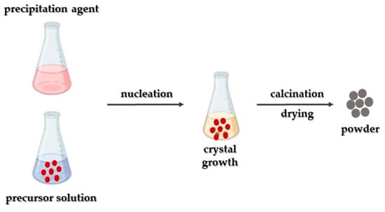 This synthetic approach finds widespread application in synthesizing nanoparticles (Figure 2). It relies on precipitation as its fundamental principle and is predominantly associated with liquid-phase synthesis [86], occasionally involving vapor-phase synthesis [87]. NaOH serves as a typical precipitating agent in this approach [88,89]. The underlying concept involves the harmonization of a precipitation reaction entailing two primary processes: (a) nucleation and (b) the growth of nuclei [90]. Typically, three fundamental principles are judged: (i) achieving single nucleation and homogeneous growth through diffusion; (ii) nucleation, growth, and aggregation of smaller subunits; and (iii) multiple nucleations and subsequent Ostwald ripening growth [91]. The precise concentration of the critical solute initiating this process significantly influences the typical procedure, where surficial solute diffusion prompts growth. Moreover, it is essential to distinctly separate these two procedures. The derived precipitate is subsequently subjected to washing as well as drying processes.