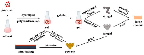 The sol-gel approach stands as a fundamental synthetic method directed towards generating novel structures, predominantly focusing on metal oxides and similar inorganic materials by employing an inorganic precursor and an organic solvent [96]. By combining metal alkoxides with appropriate solvents and reactants, uniform solutions are formed, subsequently developing into colloidal suspensions (sol) and progressing into integrated networks through poly-condensation (gel) [97]. These networks are subsequently converted into xerogels or aerogels, relying on the specific drying process employed (Figure 3).