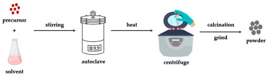 The solvothermal method comprises one of the extensively utilized approaches for the controlled crystal growth of several materials [103]. This technique involves placing a precursor and an appropriate solvent within an autoclave under elevated temperature and pressure conditions, having as a result the synthesis of the preferred products [104]. These specific reaction conditions, notably temperature and pressure, facilitate the production of materials with enhanced crystallinity as compared to the co-precipitation synthetic approach [89]. In the context of defining the “solvothermal” approach that involves utilizing a solvent apart from water, such as alcohols or various organic and inorganic solvents. Alternatively, when water serves as the solvent, the approach is defined as “hydrothermal” (Figure 4).