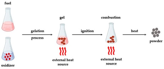 The combustion method (Figure 5) constitutes a widely utilized approach for synthesizing metal oxide nanoparticles, given its effectiveness and cost-efficiency [107]. This method encompasses two primary approaches: self-propagating synthesis and volume combustion synthesis [108]. Self-propagating synthesis involves spontaneous redox reactions ignited by an external source between the precursor (oxidizer) and reductant (fuel), mixed at the molecular level in a solution. Solid product formation occurs without additional energy input [109]. On the other hand, in volume combustion synthesis, the entire sample is heated until the reaction initiates throughout its volume. This preparation approach is more challenging to control and is particularly suitable for weak exothermic reactions that necessitate preheating before ignition [110].