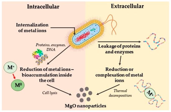 Researchers have utilized various microorganisms, alongside plants, to produce magnesium oxide nanoparticles. Numerous investigations highlight the capability of certain bacterial species to generate metal or metal oxide nanoparticles. The process of synthesizing these nanoparticles primarily occurs through intracellular or extracellular mechanisms (Figure 7). Intracellularly, metal ions are assimilated into cells, undergoing reduction facilitated by diverse enzymes and proteins within the cell, resulting in nanoparticle formation. Conversely, in the extracellular mechanism, bacterial-secreted enzymes and proteins catalyze the reduction of metal ions for the production of nanoparticles. Additionally, bacterial enzymes and proteins play a role in stabilizing these nanoparticles [8]. Nevertheless, some researchers have proposed a non-enzymatic mechanism for metal ion reduction, in order to produce nanoparticles [139,140,141]. The aforementioned alternative synthetic process relies on the interaction between metal ions and specific functional groups that are present on the bacterial cell walls, leading to the metal ions’ reduction into nanoparticles. Furthermore, this mechanism is influenced by environmental factors such as temperature, pH, and other associated conditions [126].