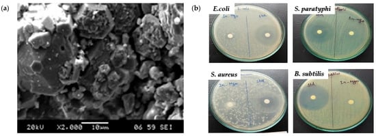 (a) SEM image of the as-synthesized nano-MgO structures and (b) their antibacterial activity study towards E. coli, S. paratyphi, S. aureus, and B. subtilis. Reprinted from [157] with permission from Elsevier Copyright 2018.
