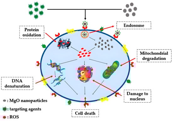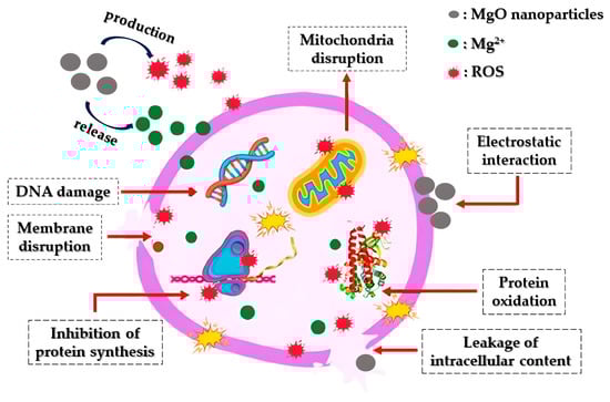 The effectiveness of MgO nanoparticles in eradicating bacteria largely relies on reactive oxygen species (ROS) production. This reliance is specifically associated with factors such as the particle’s surface characteristics, polarity, crystal size, increased oxygen defects, morphology, the ability of molecules to chemically diffuse, as well as the release of Mg2+ ions. The bactericidal process involving magnesium oxide nanoparticles entails sterilization through particle release, a multifaceted mechanism, and absorption. The crystals’ size and their extensive surface area may contribute significantly to their potent antibacterial properties. Superoxide radicals, formed through reactions between H2O2 and ROS, inflict damage on cellular proteins and DNA, leading to cell death [160].