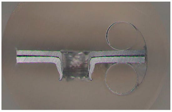 Process parameters: tool speed 3800 min−1 and feed rate 250–700–200 mm/min, which means that the initial tool feed rate was 250 mm/min, gradually increasing to 700 mm/min on the 11.5 mm toolpath, and finally, on the 1.5 mm toolpath, the feed rate dropped to 200 mm/min and the tool stopped 0.6 mm below the flange part of the tool to prevent deformation or damage to the collar (Figure 2).
