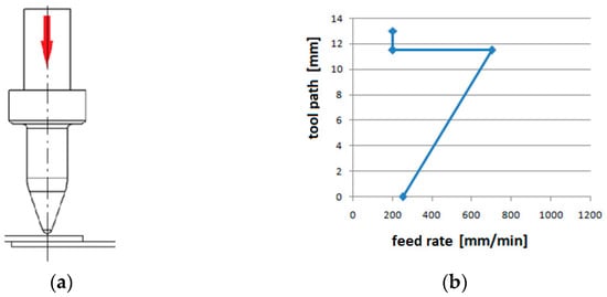 Tool feed mode. (a) Flowdrill tool, feed direction indicated by red arrow, (b) tool feed rate 250–700–200 mm.min−1.