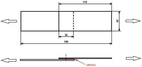 Flowdrill joining (FD) has also been tested in combination with adhesive bonding (AB). For this purpose, the same adhesives Teroson RB 5197 and Teroson EP 5090 were used. No surface preparation was carried out prior to bonding, and the adhesives were applied directly to the untreated (electrostatically oiled) surface. The overlapping area of the hybrid joints was the same, i.e., 30 × 40 mm (Figure 5). The shape, dimensions, and load of the test specimens for bonding and thermal drilling joint formation were the same as in Figure 3.