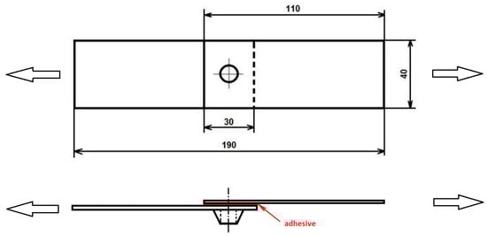 When calculating the dimensions of the test bodies, the procedure followed standard ISO 12996:2013 [35], according to which the dimensions of the test bodies are derived from the diameter of the mechanical fastener, in this case, from the diameter of the formed hole in the materials to be joined. The shape, dimensions, and load of the test specimens for thermal drilling joints are given in Figure 3.