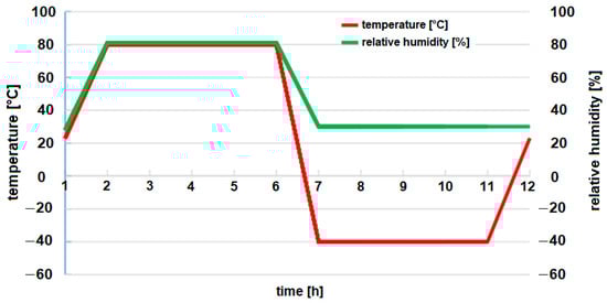 A part of the joints was tested for load-bearing capacity as made, a part of the joints was subjected to the alternating climate resistance test (CT), accredited according to PV1200 for the testing of parts in the automotive industry, in the AZL M36-KK climate chamber (Weiss Umwelttechnik GmbH, Berlin, Germany). One test cycle is shown in Figure 7. The joints were subjected to 10 test cycles. This is an environmental cyclic climate change test for test units, e.g., vehicle parts in the engine compartment. Within one cycle, the temperature varies from −40 °C to +80 °C, relative humidity from 30% to 80%. Duration of one cycle: 12 h; 10 cycles lasted 5 days.