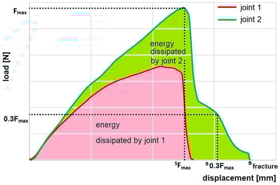 Joint characteristics obtained from force–displacement curves: joint 1—mechanical joint, joint 2—hybrid joint (mechanical joining and adhesive bonding).