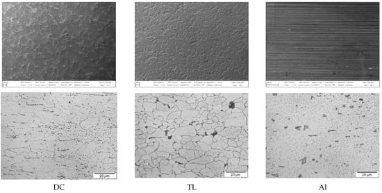 DC steel has a fine-grained ferritic structure with very little amount of pearlite (due to the low carbon content), with recrystallized grains slightly elongated in the rolling direction. In addition to the ferritic grains, numerous very small precipitates are visible in the structure. In the work in [37], the authors identified, by means of SEM and EDS, precipitates in DC04 steels such as calcium silicates and aluminates, which adversely affect the formability of the plates, but also AlN precipitates, which contribute to the formation of eqiuaxed grains and, therefore, to the improvement of the formability of these steels. TL steel has a ferritic structure with a small amount of pearlite and a very fine grain due to the addition of niobium [38]. The microstructure of the Al alloy is formed by Mg2Si precipitates in the α-Al matrix, AlSiFeMn intermetallic phases, and Mn-rich particles [39].