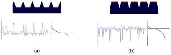 The Abbot–Firestone curve shows some differences for ungalvanized steel, galvanized steel, and Al. Based on the surface appearance and the profilograms, it is clear that the surface of the uncoated DC material can be characterized by the scheme in Figure 11a, as a relatively smooth surface with sporadic peaks, while the galvanized steel TL has the opposite character of irregularities as that in the scheme in Figure 11b: a relatively smooth surface with sporadic valleys. This is confirmed by the SEM images of the material surfaces (Figure 9).