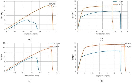 Load–displacement curves of DC-Al and TL-Al hybrid joints for both adhesives as joined and after CT. (a) RB, as joined. (b) EP, as joined. (c) RB, after CT. (d) EP, after CT.